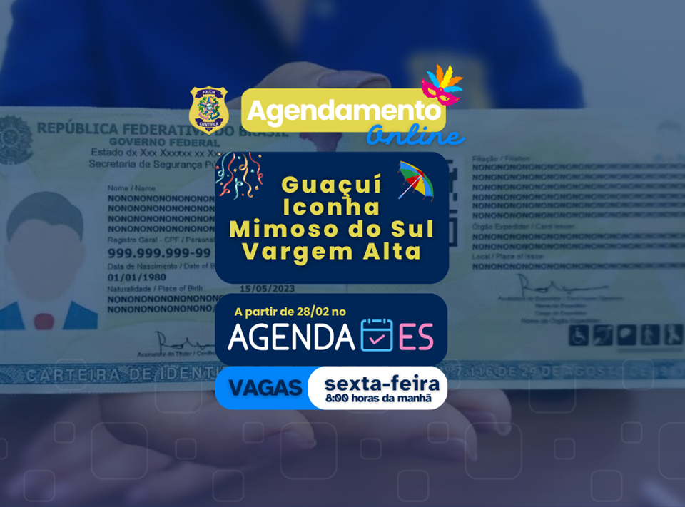 A Polícia Científica do Espírito Santo (PCIES), por meio do Instituto de Identificação (II) e da Seção Regional do Posto de Identificação Civil da Diretoria Regional de Polícia Científica Sul (DISUL), adicionou os Postos de Identificação de Guaçuí, Iconha, Mimoso do Sul e Vargem Alta ao portal de agendamentos on-line do Governo do Estado. A partir desta sexta-feira (28), os cidadãos desses municípios poderão realizar o agendamento todas as sextas-feiras, às 8 horas.