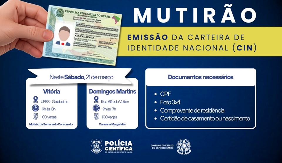 A Polícia Científica do Estado do Espírito Santo (PCIES), por meio do Instituto de Identificação (II), realizará atendimentos para emissão da Carteira de Identidade Nacional (CIN) nos municípios de Vitória e Domingos Martins, neste sábado (21).